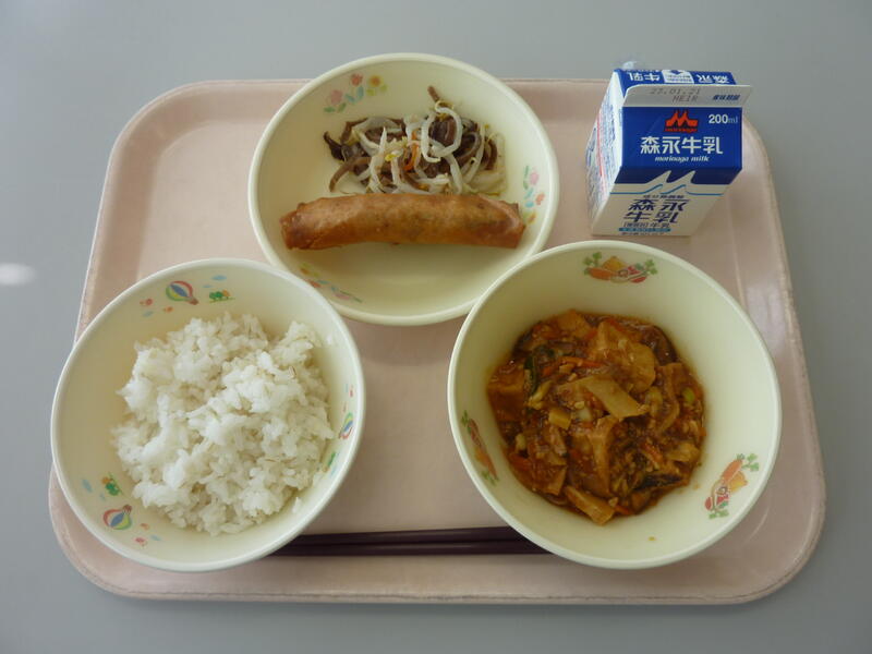 1月10日(火)の給食(麦ご飯 牛乳 マーボー厚揚げ パリパリ春巻き もやしときくらげの中華和え)