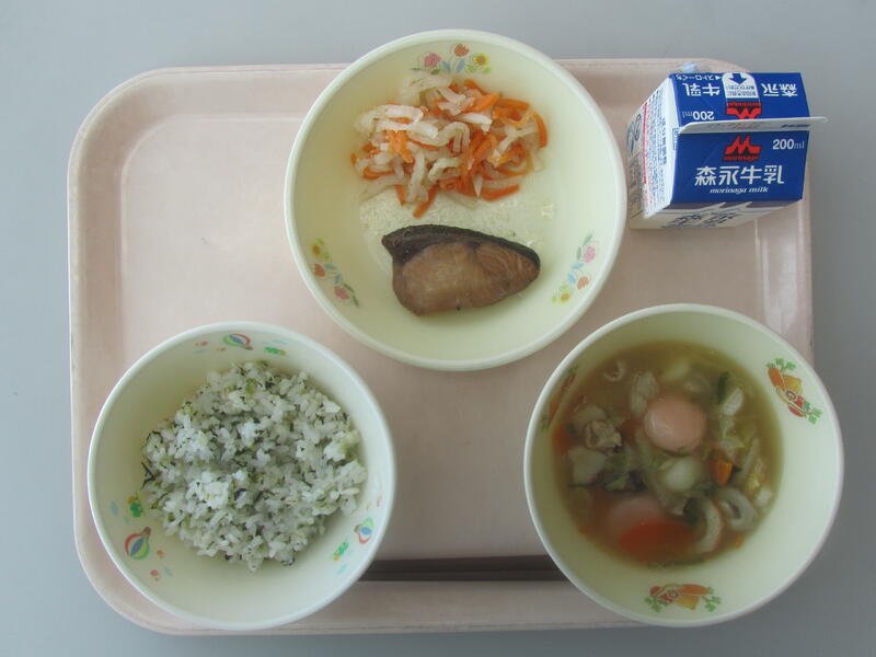 1月11日(水)の給食(菜めし 牛乳 雑煮 ぶりの照り焼き 紅白なます)
