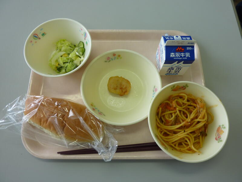 3月2日(木)の給食(食パン 牛乳 ボローニャ風パスタ 鶏のからあげ イタリアンサラダ)