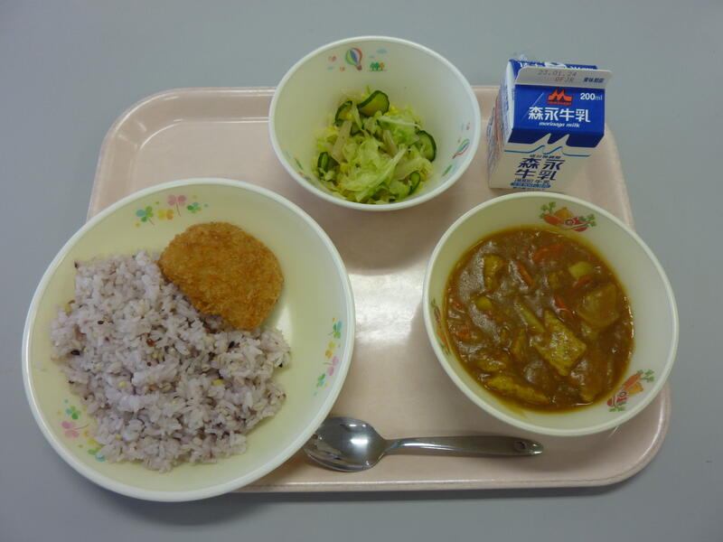 2月1日(水)の給食(麦ご飯 牛乳 カレー肉じゃが お豆腐しんじょ 変わりあえ)