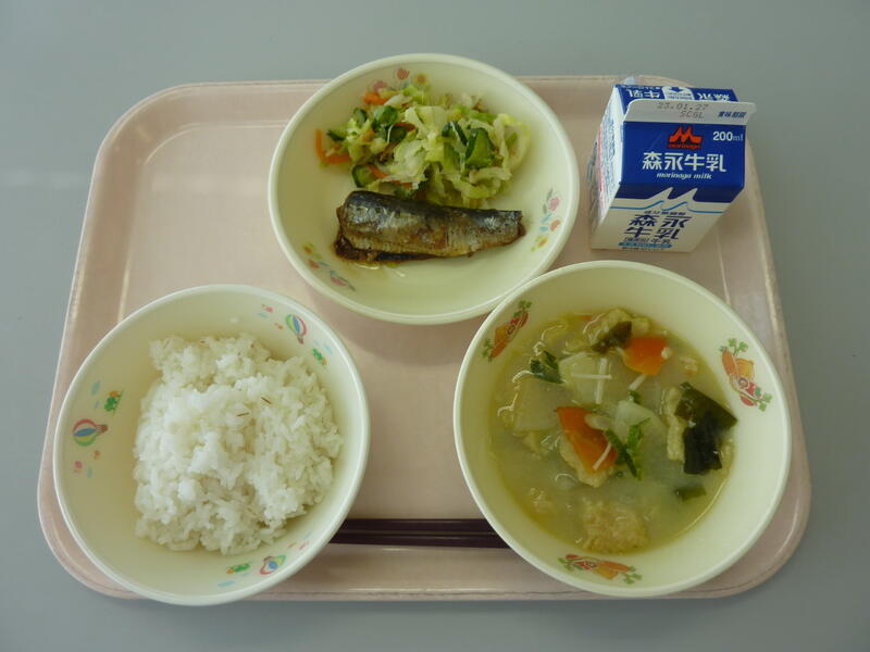 2月7日(火)の給食(麦ご飯 牛乳 白菜のみそ汁 さんまのみぞれ煮 キャベツといんげんのごま和え)
