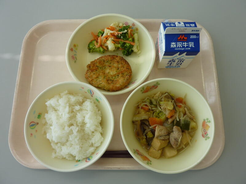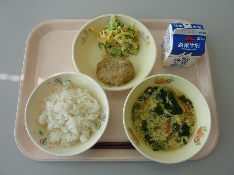 1月23日(月)の給食(麦ご飯 牛乳 かきたま汁 豆腐ハンバーグのおろしソース マカロニサラダ)