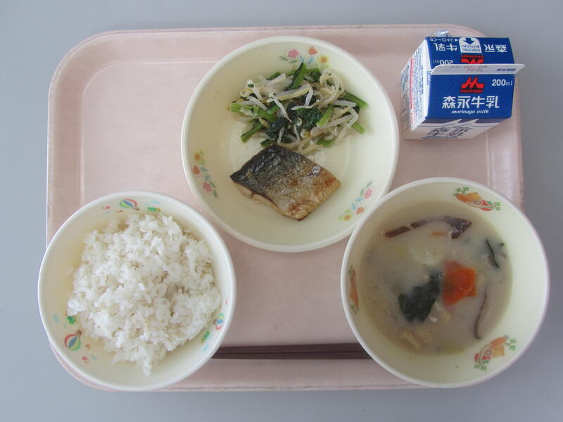 3月13日(月)の給食(麦ご飯 牛乳 春キャベツのみそ汁 さば柚子味噌煮 ほうれん草のごま和え)