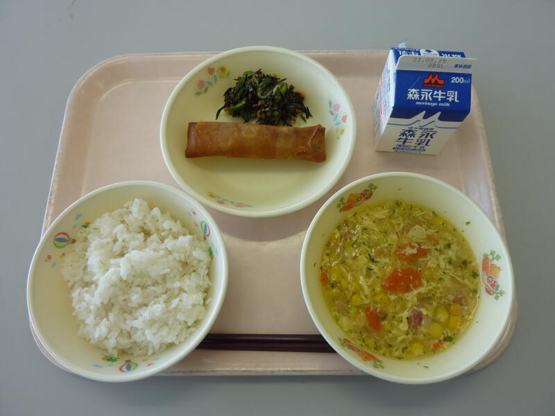 3月14日(火)の給食(麦ご飯 牛乳 スーミータン パリパリ春巻き ひじきサラダ)