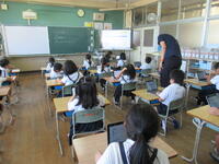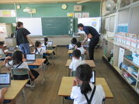 上の写真は、担任の先生とICT支援員の先生が一緒に子どもたちに使い方を教えているところです。