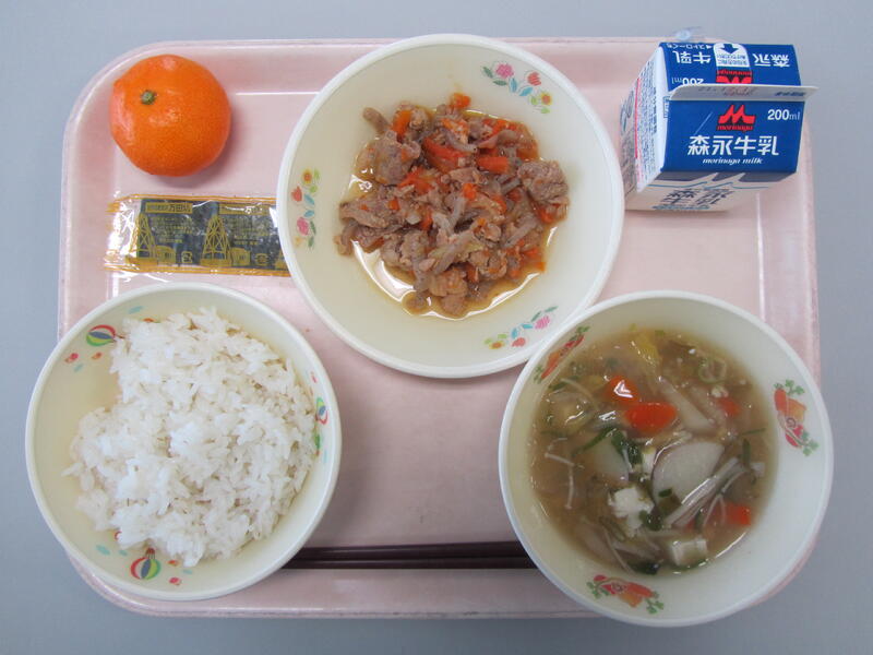 12月1日(水)の給食(麦飯 牛乳 うすくず汁 豚肉の生姜煮 焼きのり みかん(天水産))