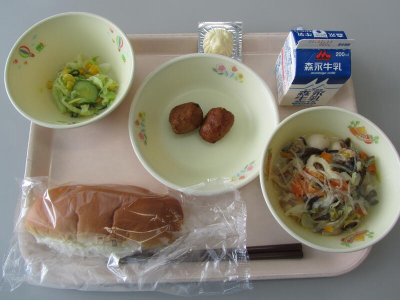12月2日(木)の給食(ミルクパン 牛乳 タイピーエン たれ肉団子 コーンサラダ チーズ)