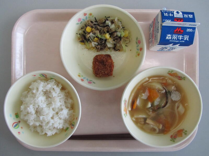 9月1日(水)の給食(麦ごはん 牛乳 だんご汁 高野豆腐のフライ ストックサラダ)