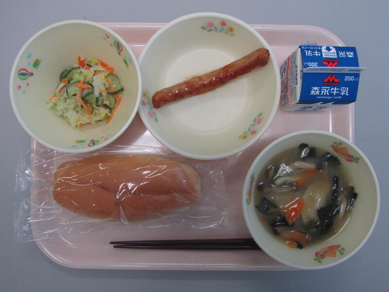 9月2日(木)の給食(たてわりコッペパン ラビオリスープ ウィンナーのケチャップソース コールスローサラダ)