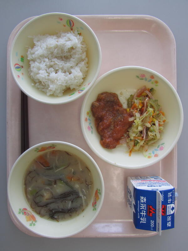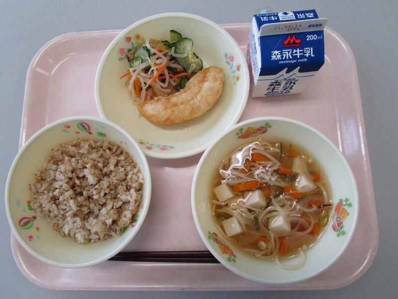 9月22日(水)の給食(こぎつねごはん 牛乳 冬瓜のそぼろ汁 魚とひじきの豆腐よせ 茎わかめサラダ)