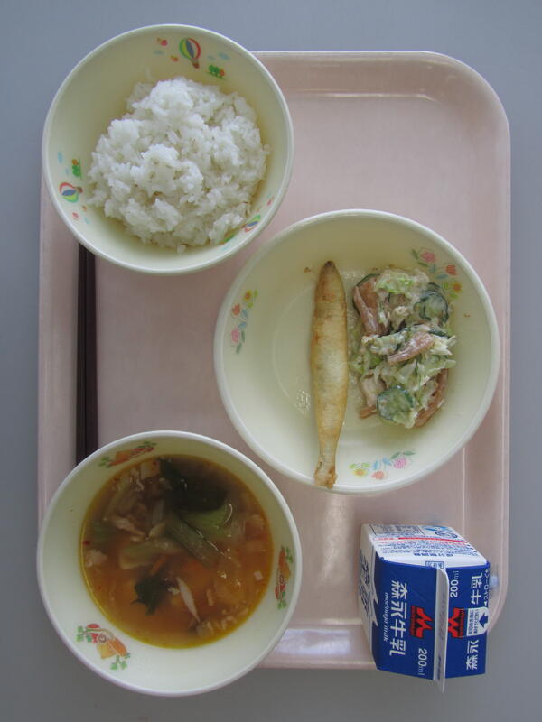 9月10日(金)の給食(麦ごはん 牛乳 キムチスープ ししゃもフリッター こんにゃくサラダ)