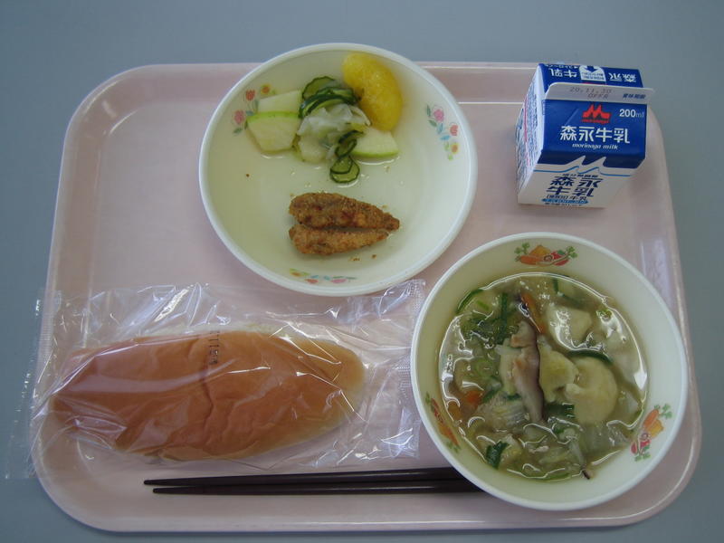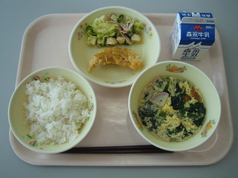 11月4日(水)の給食(麦ごはん、牛乳、かき卵汁、ささみのレモン漬け、豆腐のサラダ)