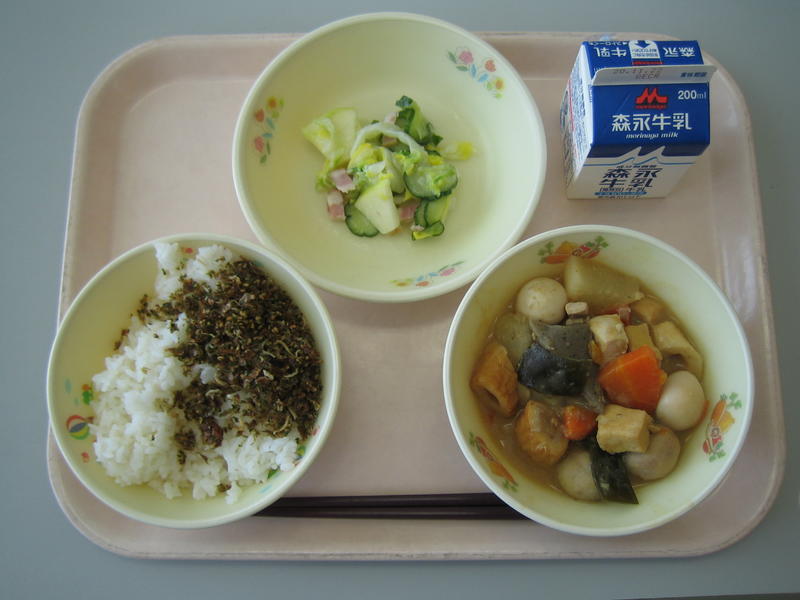 11月11日(水)の給食(麦ごはん、牛乳、みそおでん、白菜とりんごのサラダ、手作りふりかけ)