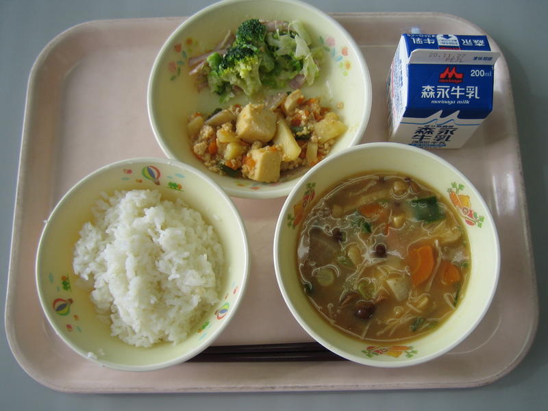 11月2日(月)の給食(麦ごはん、牛乳、マーボー豆腐、春巻き、中華ごまあえ)