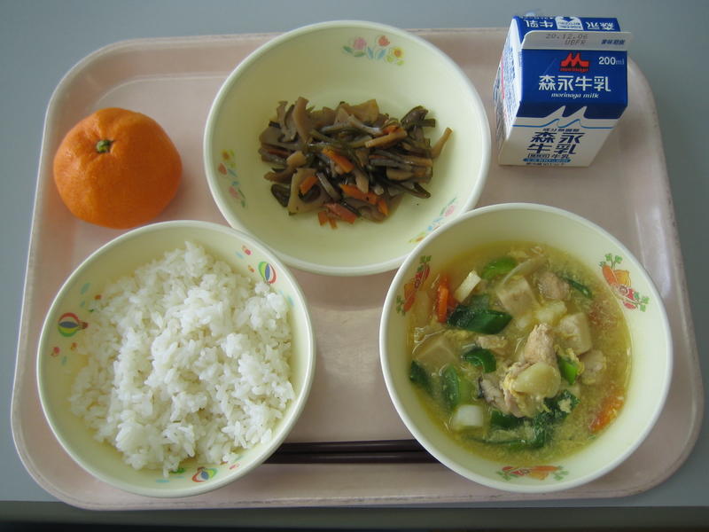 11月25日(水)の給食(麦ごはん、牛乳、高野どうふの卵とじ、茎わかめのきんぴら、みかん)