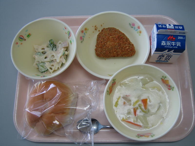 11月26日(木)の給食(丸パン、牛乳、白菜の米粉クリームシチュー、かぼちゃコロッケ、れんこんサラダ)