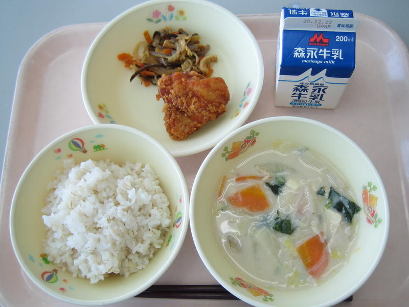 12月11日(金)の給食(『味のたび献立』麦ごはん、牛乳、飛鳥汁、鶏の竜田揚げ、奈良あえ)