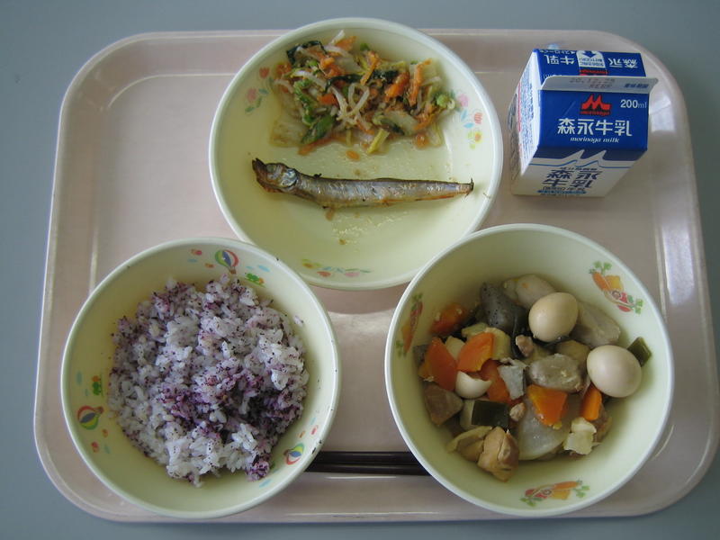 12月22日(火)の給食(『まごわやさしい献立メニュー』麦ごはん、牛乳、さつま汁、いわしのかば焼き、わかめの酢のもの)