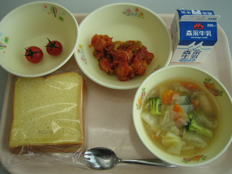 12月17日(木)の給食(かぼちゃパン、牛乳、野菜のスープ煮、白身魚のチリソースいため、ミニトマト)