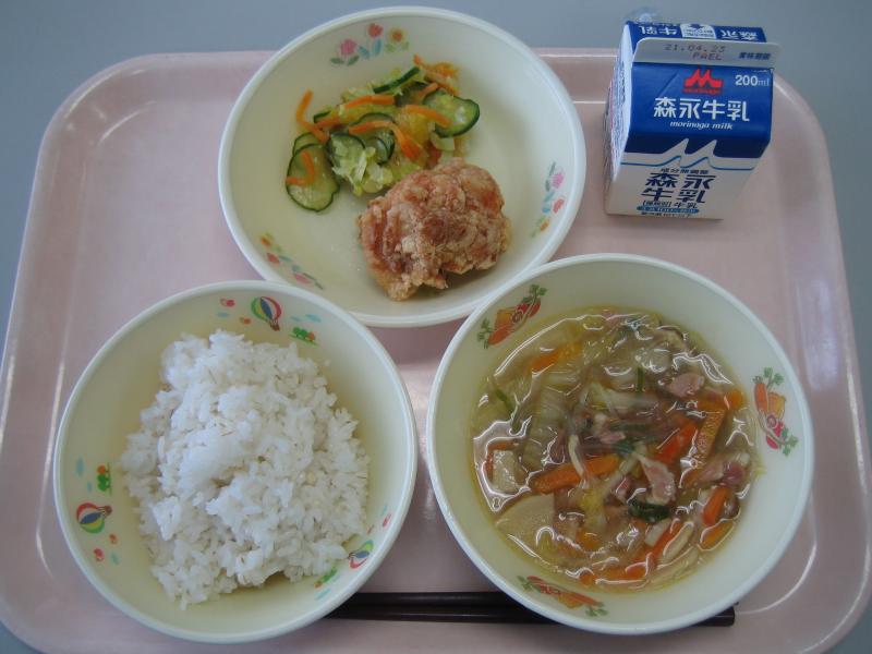 4月12日(月)の給食(麦飯 春雨汁 鶏からあげ 甘夏サラダ)