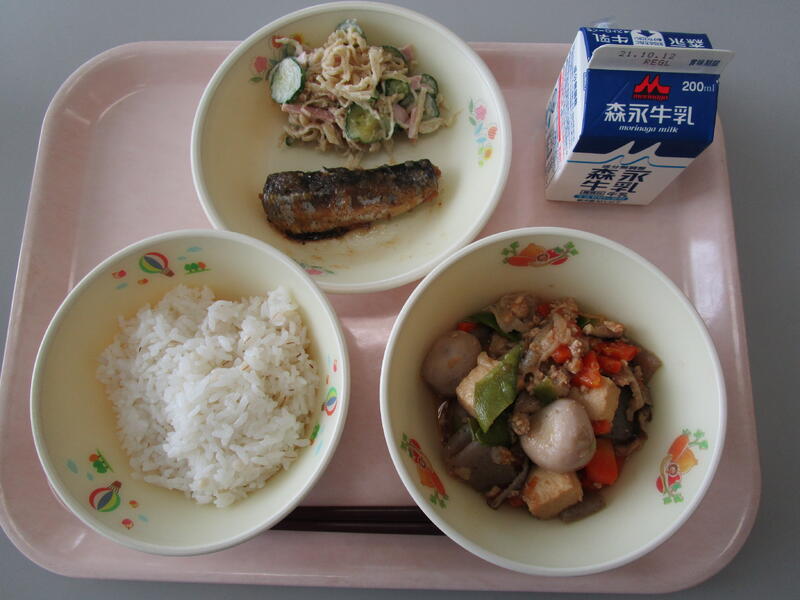 10月26日(火)の給食(麦飯 牛乳 高野豆腐の卵とじ 干し魚の香り焼き だいこんの梅マヨサラダ)
