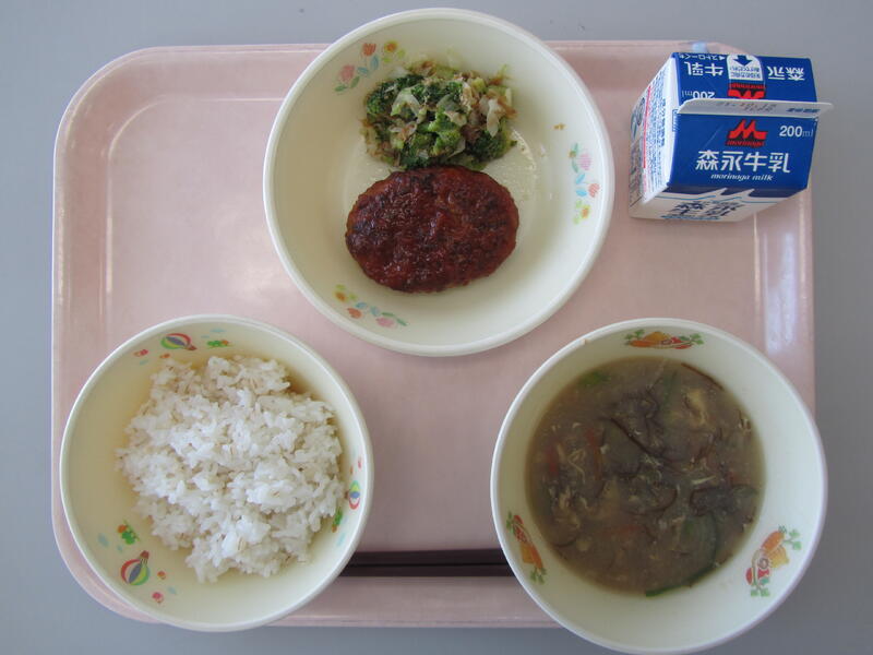 10月4日(月)の給食(麦ごはん 牛乳 海のお野菜卵スープ ハンバーグのサラ玉ソースかけ ブロッコリーのおかかサラダ)