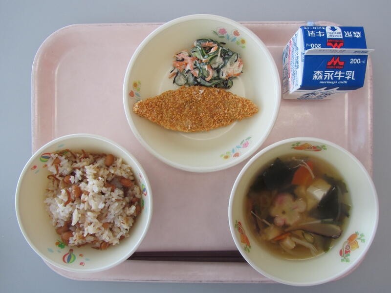 10月5日(火)の給食(豆じゃこご飯 牛乳 ふのすまし汁 白身魚のカリカリあげ ひじきとささみのマヨあえ)