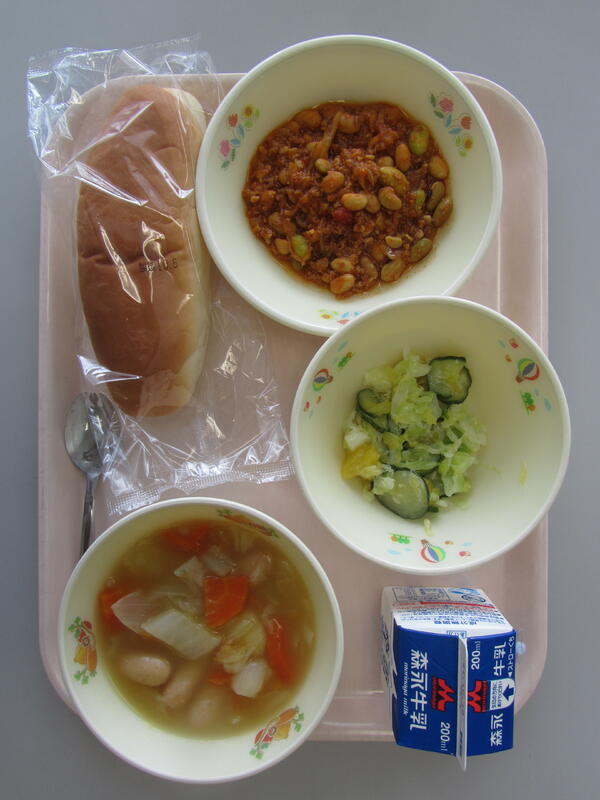 10月07日(木)の給食(コッペパン 牛乳 洋風にこみ チリコンカン 甘夏サラダ)