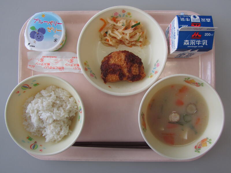 10月8日(金)の給食(麦ごはん 牛乳 うち豆汁 ソーストンカツ こっぱなます ブルーベリーゼリー)