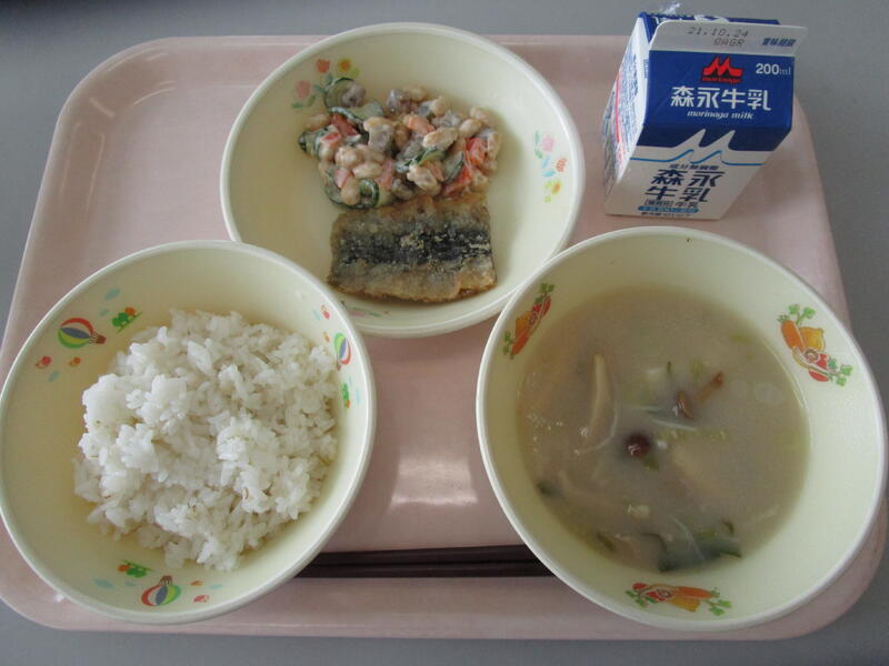 10月13日(水)の給食(麦飯 牛乳 きのこのみそ汁 秋刀魚のかば焼き お豆でかみかみサラダ)
