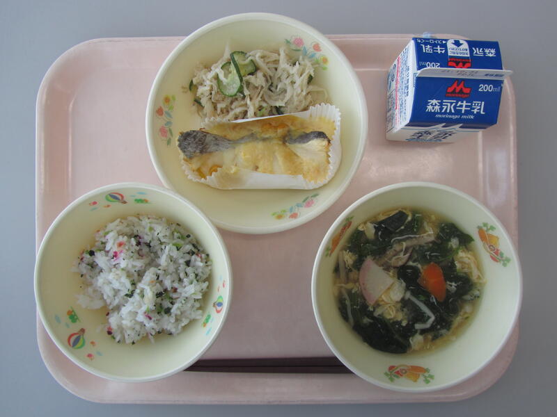 10月20日(水)の給食(五色の花ごはん かきたま汁 魚のこがねやき 切干大根のじゃこサラダ)