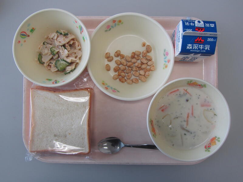 10月21日(木)の給食(食パン 牛乳 鮭のクリーム煮 きなこ豆 れんこんサラダ)