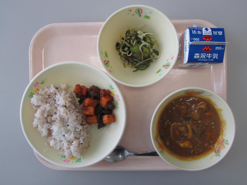 10月22日(金)の給食(雑穀ごはん 牛乳 秋のめぐみカレー レバーのオーロラソース 海そうサラダ)
