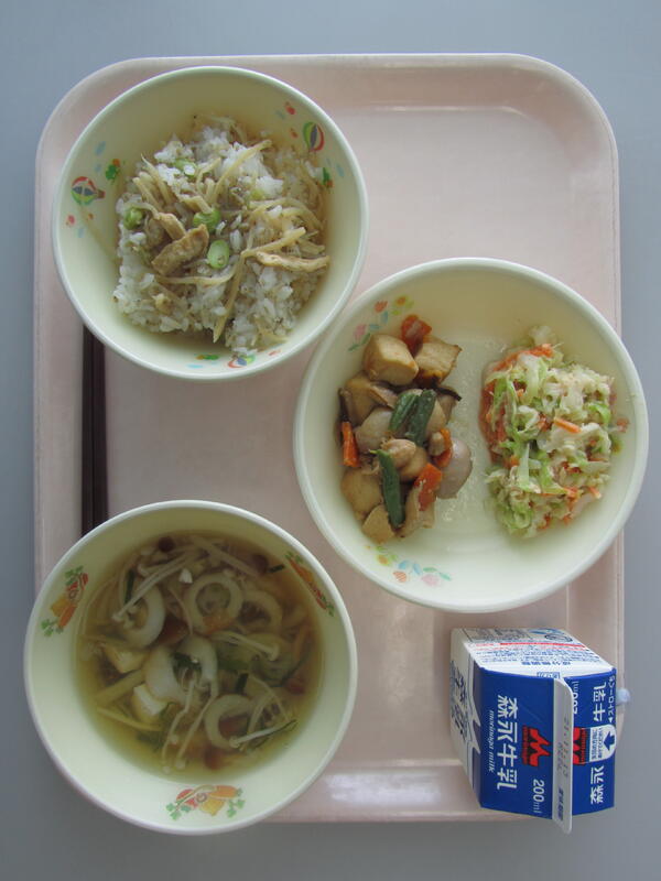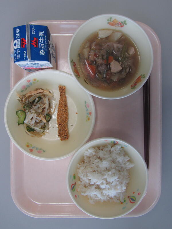 4月12日(月)の給食(麦ごはん 牛乳 春雨汁 魚のレモン漬け たくあんサラダ)