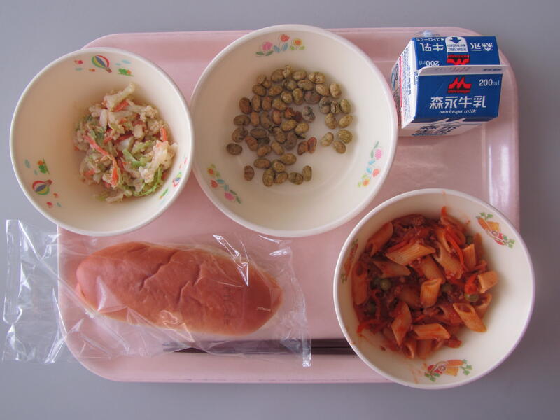 11月4日(木)の給食(ミルクパン 牛乳 ペンネのミートソース 抹茶大豆 カリフラワーのごまサラダ)