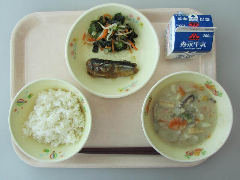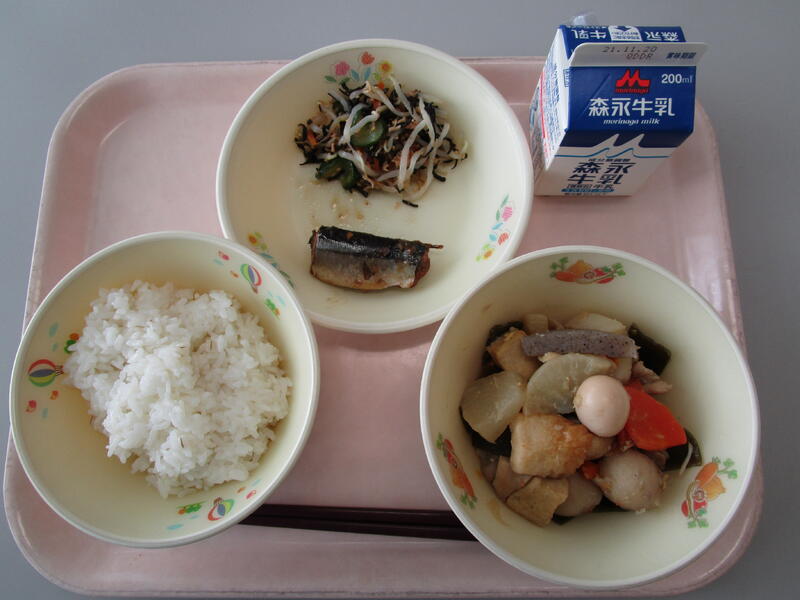 11月29日(月)の給食(麦ごはん 牛乳 おから汁 さんまみぞれ煮 わかめの酢の物)