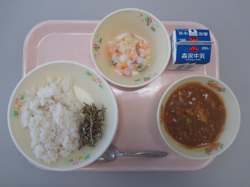 11月12日(金)の給食 麦ごはん 牛乳 畑の肉カレー カムカムいりこ ヨーグルトあえ