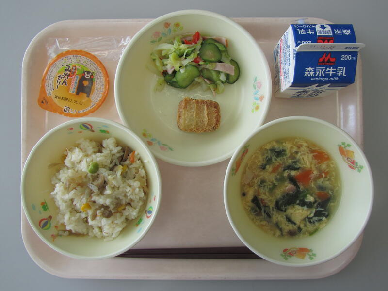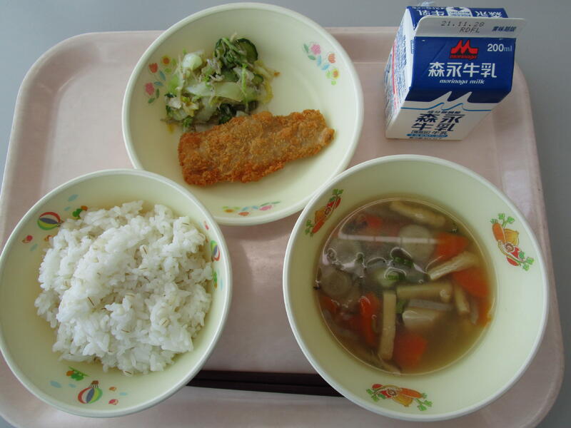 11月15日(月)の給食(鶏ごぼうピラフ 牛乳 洋風かきたまスープ お魚ナゲット イタリアンサラダ みかんゼリー)