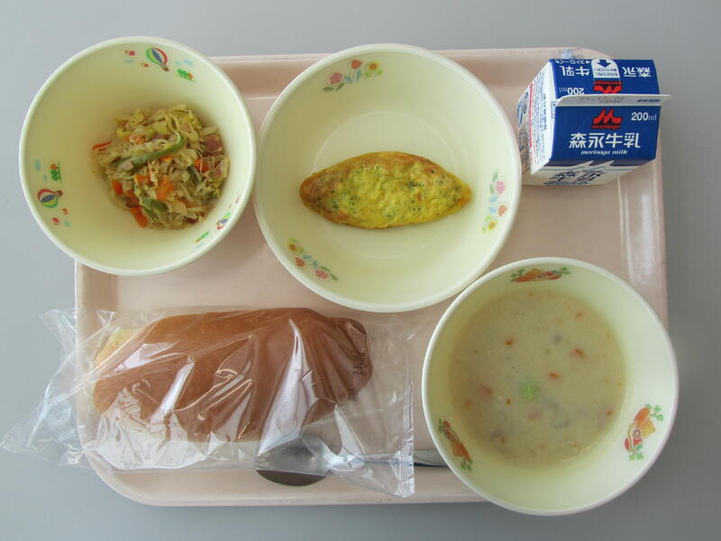 11月25日(木)の給食(コッペパン 牛乳 まめっこポタージュ ほうれんそうオムレツ 切干大根のソテー)