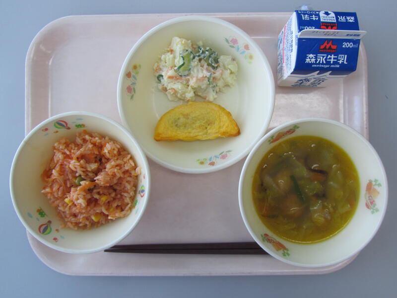 12月10日(金)の給食(チキンライス 牛乳 つくねスープ オムレツ ポテトサラダ)