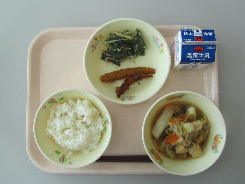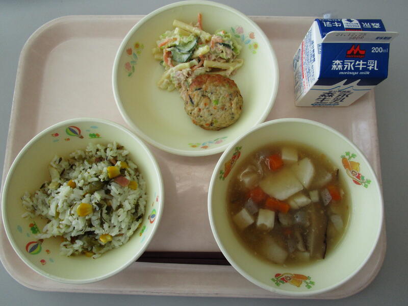 12月14日(火)の給食(高菜炒飯 牛乳 彩り野菜の豆腐よせ のっぺい汁 マカロニサラダ)