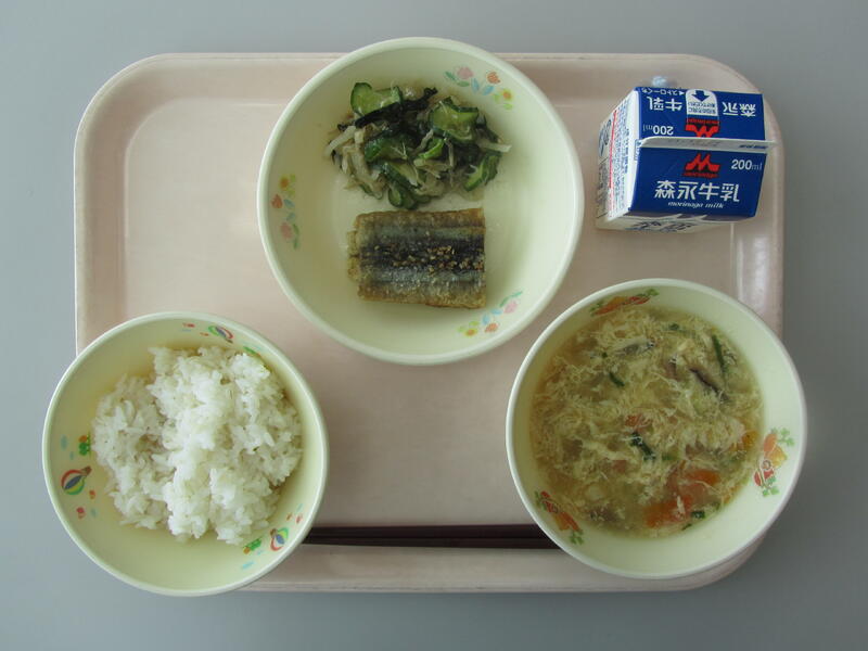 12月15日(水)の給食(麦飯 牛乳 かき玉汁 さんまのかばやき じゃこサラダ)