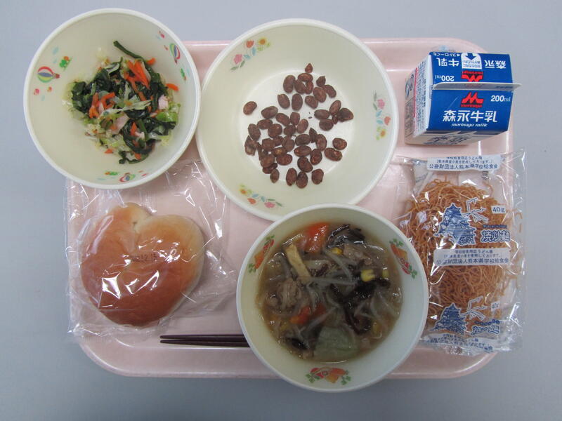 12月16日(木)の給食(米粉パン 牛乳 パリパリ焼きそば ココア豆 ほうれんそうのサラダ)