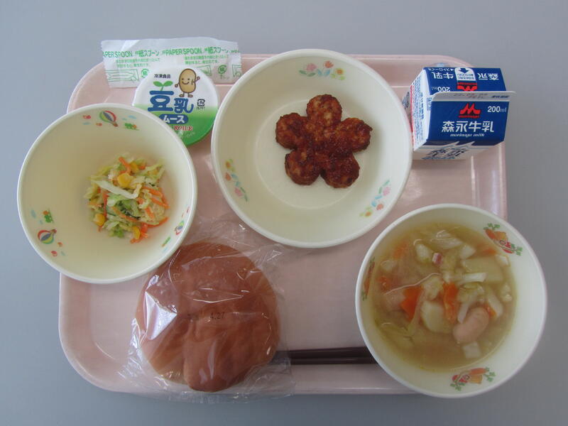 4月28日(木)の給食(丸パン(よこわり) 牛乳 野菜スープ 花型とうふハンバーグ コールスローサラダ 豆乳ムース) 投稿日時 : 2022/04/28 学校サイト管理者 0 {{options.likeCount}} {{options.likeCount}} {{options.unlikeCount}} {{options.unlikeCount}}