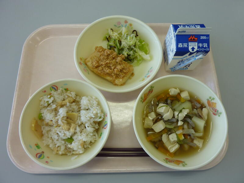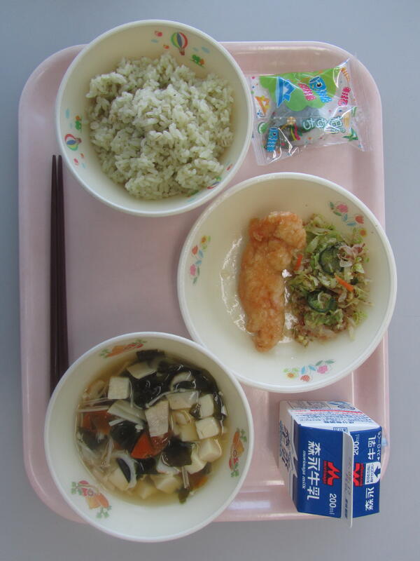 5月2日(月)の給食(茶飯 牛乳 わかたけ汁 ささみのレモン漬け かつおあえ かしわもち)