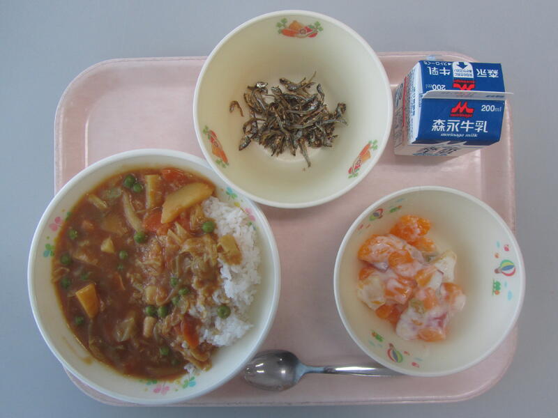 5月6日(金)の給食(麦ごはん 牛乳 春野菜のカレー いりこの酢炊き ヨーグルトあえ)