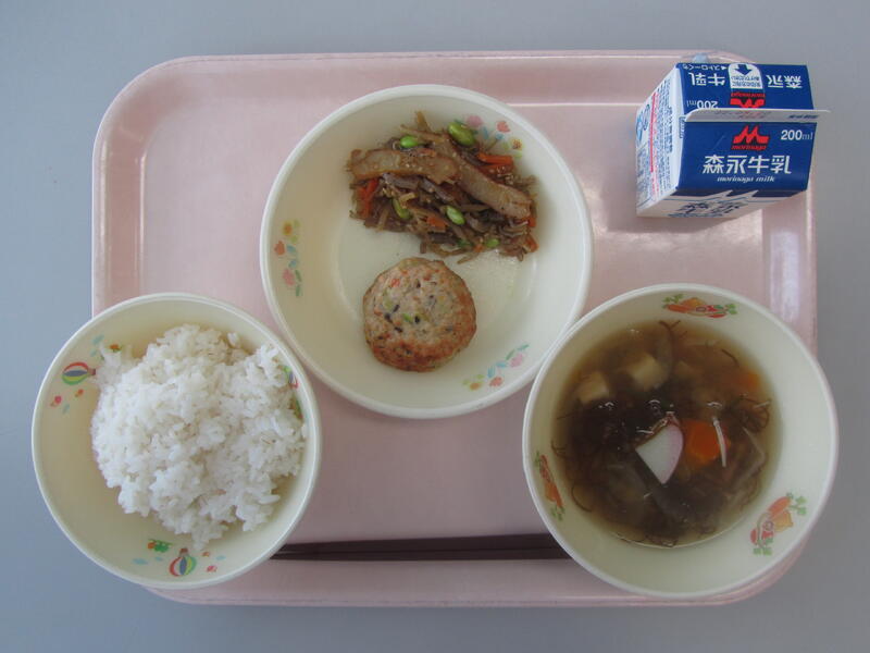 5月9日(月)の給食(麦ごはん 牛乳 もずくのすまし汁 彩り野菜の豆腐よせ 五目きんぴら)
