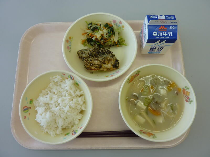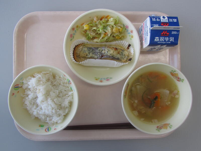 5月16日(月)の給食(麦ごはん 牛乳 根菜スープ ホキのみそマヨ焼き サラたまあえ)