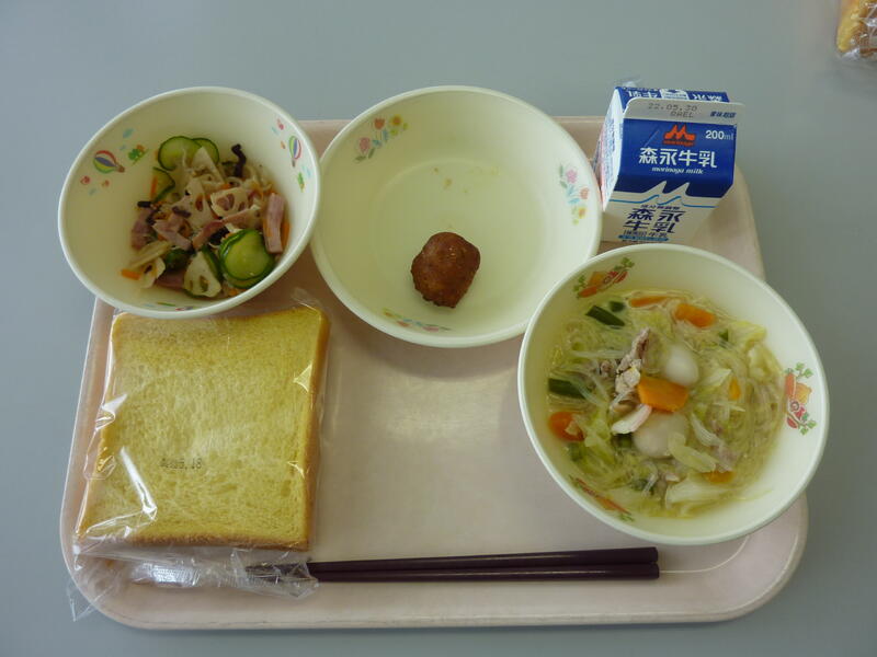 5月19日(木)の給食(かぼちゃパン 牛乳 タイピーエン 鶏つくね かりかりサラダ)