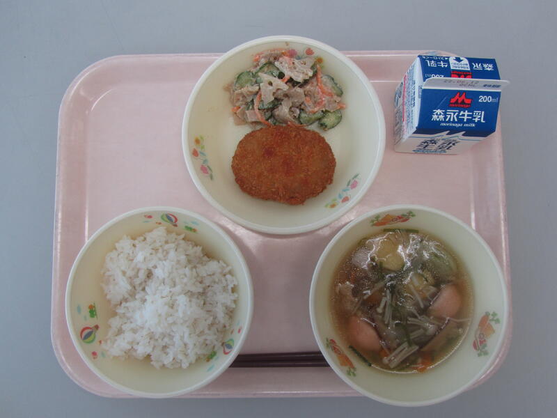 6月1日(水)の給食(麦ごはん 牛乳 おやさいつみれ汁 うまかコロッケ れんこんサラダ)